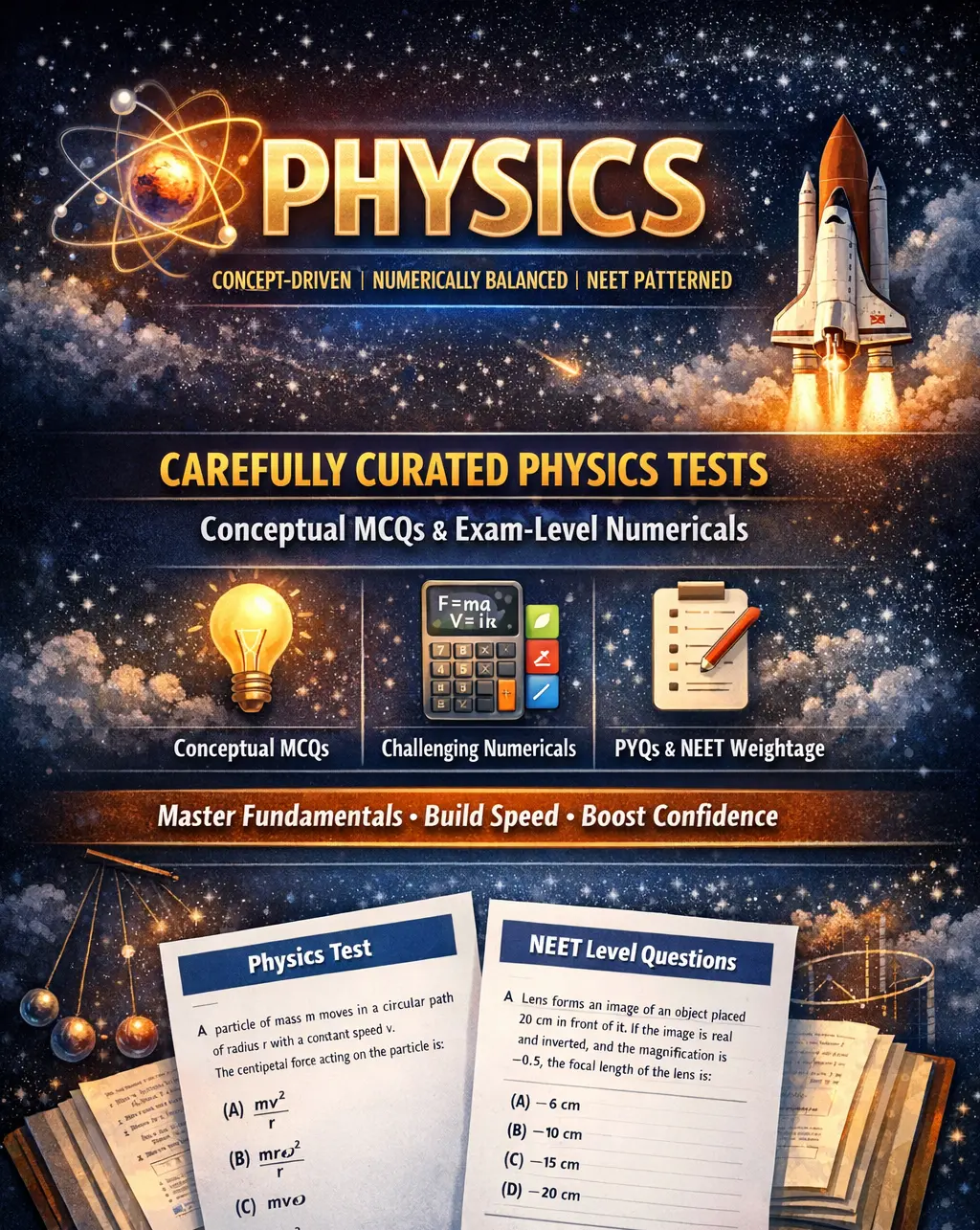 Carefully curated Physics tests combining conceptual MCQs and exam-level numericals. Questions are mapped to NEET weightage patterns and PYQ difficulty levels, helping students master fundamentals while building speed and problem-solving confidence.